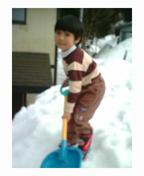 玄関先の雪の山に登り満足そうな四代目SYNSKです、立ち位置は高さ3メートル以上ある雪の山頂です。