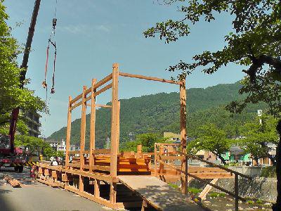 クレーンで木材を運び、川からせり出した舞台造りです。j