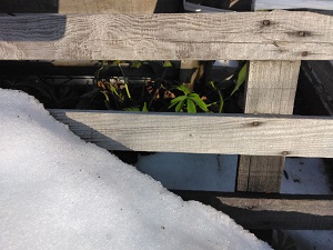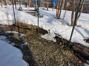 除雪した通路も雪解けが進み周辺は植物が