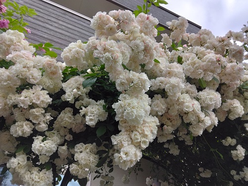 М型アーチのツルバラ誘引が中々進まないで
