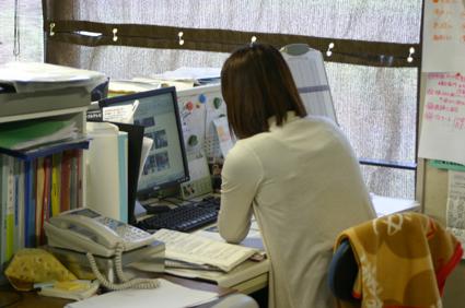 【写真は、中継準備のため、必死にPCに向かう、金子春香でっす】