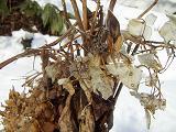 『紫陽花』は花が咲き終わった後「芯切り」をして翌年の花をきれいに咲かせる準備をします。でも今朝偶然除雪機で掘った後に覗いたのがこの紫陽花。多分私が昨年芯切りし忘れたんでしょう。乾燥した花が凍りつき、可憐とも淋しいとも両方の表現ができる花になりました。環境によっていろんな一面がみれるものですね。人間も基本は同じですが、花と違って「欲」がでてしまいますね。