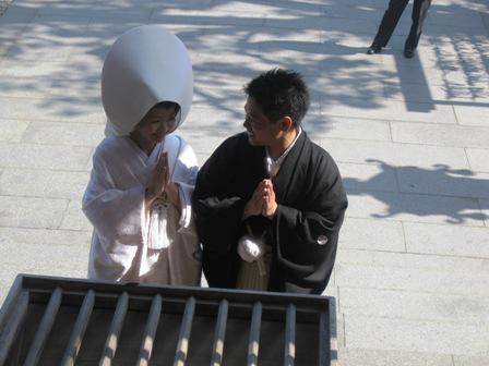 白無垢で烏帽子山の八幡神社で手を合わせ・・・