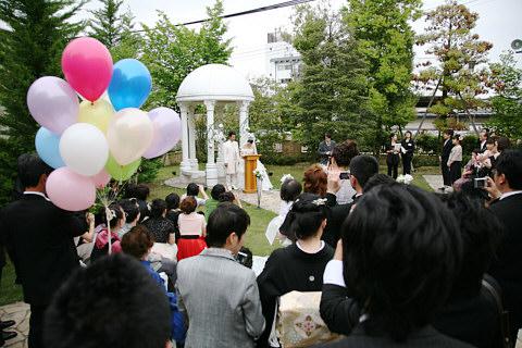 28日心配していた雨も何とか持ちこたえ、待望のガーデンでの人前挙式が行われました。バルーンリリースの後全員集合写真も予定通り!お披楽喜の際にはその写真が素敵なアルバムとなりお見送り品に!