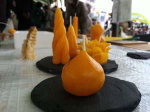 11月11日(日)宮城県石巻市のサン・ファン・バウティスタパークで開かれた「おらほの復興市」で、雄勝石のキャンドルスタンド作りとコラボして、蜜蝋キャンドル作りを楽しんでいただきました。雄勝石は東京駅の屋根材やすずり石に使われています。使用したのは、がれきの中から拾い集めたスレート材です。蜜蝋の色にとてもマッチして人気でした。