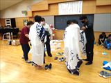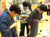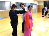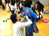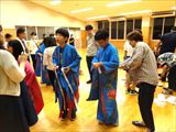 本日は、夕方6時半から獅子踊りの衣装合わせ・着付け教室が行われています。お二人のお師匠様においでいただいております。保護者の方々にもお力をお借りしています。