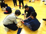 まずは、役割によってどんな衣装を付けなければならないかから。5,6年生の子どもたちですが、はじめて衣装を身に付ける人も。やはり簡単ではないようですね。