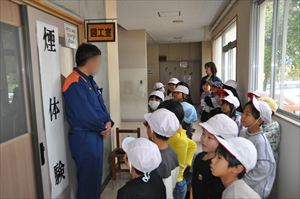 今日は日曜日ですが、本校を会場に長井市総合防災訓練が実施されるため登校日です。致芳小学校の避難訓練を皮切りに開始されることになっていましたが、雨天のため避難訓練は中止に。そこで、雨天メニューに切り替わり、学級ごとに防災に関わる様々なブースを見学することになりました。