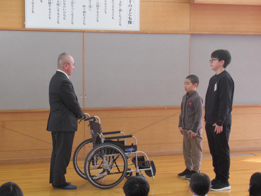 全校朝会の時間を利用して、車椅子の贈呈式を行いました。この車椅子は、児童会活動の環境委員会が中心となってのアルミ缶回収での収益金で購入したものです。ご家庭の皆様をはじめ、地域の皆様からもたくさんのご協力をいただきました。たくさんの方々の気持ちが形となってあらわれたものと思っています。