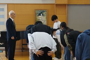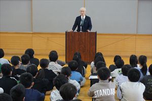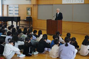 今朝の全校朝会は、日頃、登下校の様子を見守っていただいている「見守り隊」の皆さんへ感謝の思いを伝える会です。おいでいただいたのは、20年以上に渡り、交通安全指導や見守り活動をしていただいているKさん。毎日、お世話になっております。