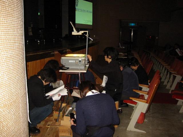 スタッフは大変です。要約しながら筆記することはかなりの重労働(しかもOHPがまぶしいので目が疲れる)のため、何分か毎に交代しながらでないともたないそうです。