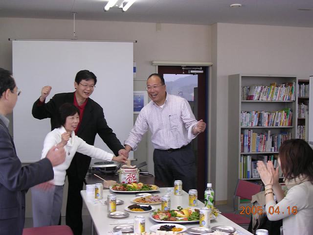 花見はミーミンパパの事務所で、5月21日のフォーラム成功を祈念して、カンジが用意してくれた”鏡割り”からスタートしました。