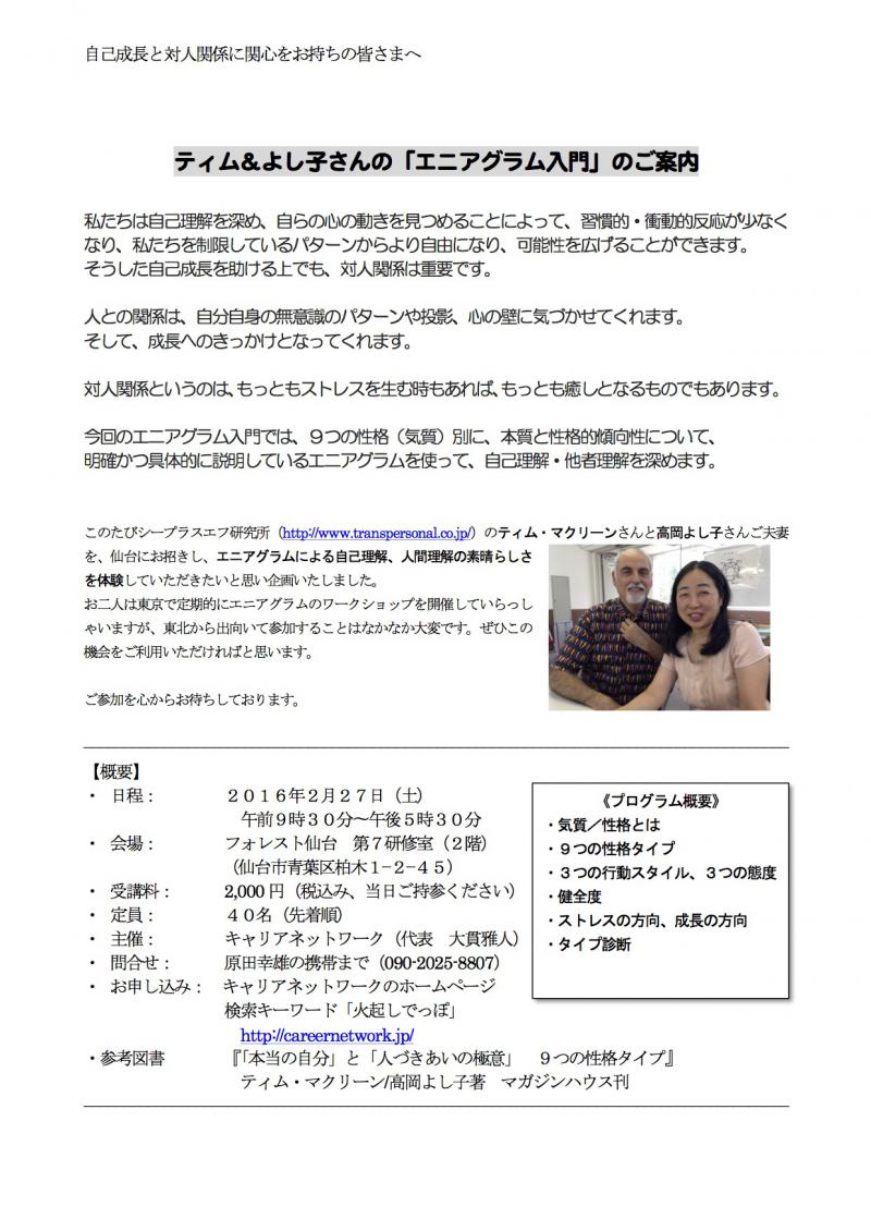 このたびシープラスエフ研究所研究所のティム・マクリーンさんと高岡よし子さんご夫妻を、仙台にお招きし、エニアグラムによる自己理解、人間理解の素晴らしさを体験していただきたいと思い企画いたしました。