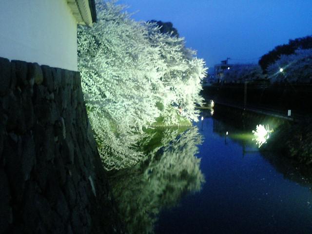 白壁、桜の薄いピンク、夜空のブルー、お堀の土手の草のグリーン。