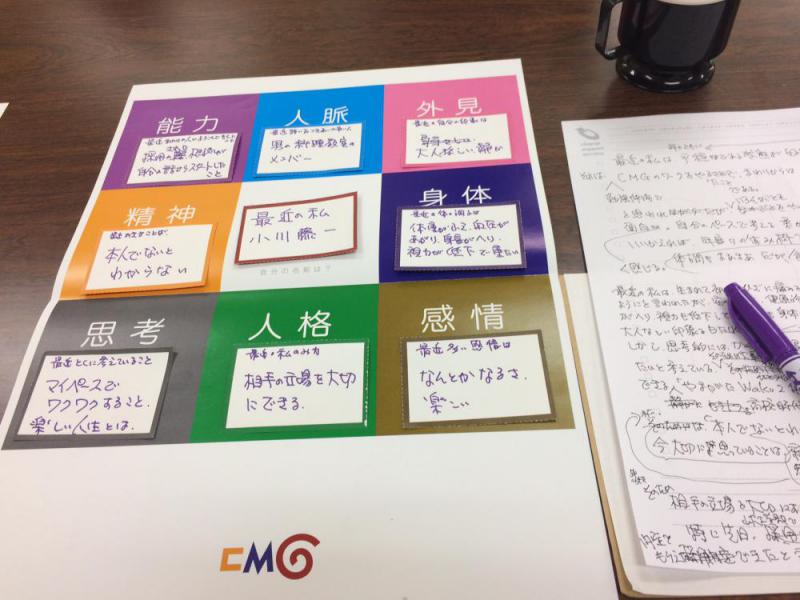 上記8つの切り口で白紙のカードに「最近のわたし」の言葉を記入し、近況報告をした。