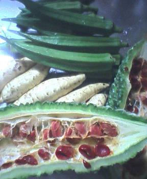 このサツマイモは小さく、一緒に写っているオクラは大きい品種なんで、ちょっと不思議でしょ♪あ、手前は完熟して種が真っ赤になったゴーヤです。(実家の近所のもので530gもありました!)