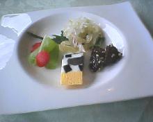 一番手前は、ピータンの白身部分と黄身部分をバラして粗く刻み、玉子の白身と黄身・2色のムースでまとめた、ワザありの1品。