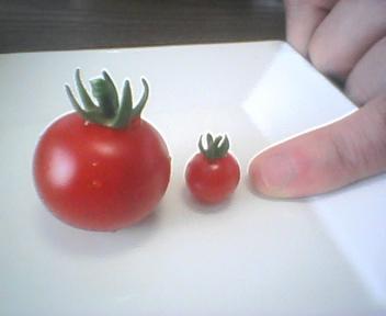(左は鉢植えトマト。丈は15cmぐらいにしかならないけれど、実(み)は普通のミニトマトサイズ)