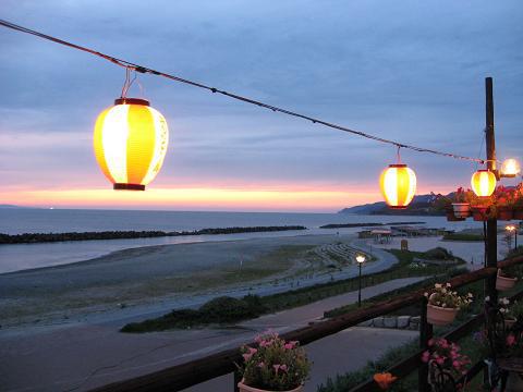 暑くなく、寒くなく、風もそよそよと気持ちいい程度で、虫はこないし、生ビールは美味しいし、そして、夕日も♪ 空一面ではなかったけれど、水平線と雲の間が赤く染まりました。