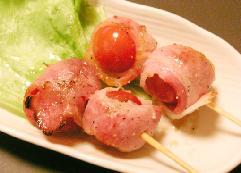 旬のプチトマトをベーコンで巻いて炭火で焼き上げました。