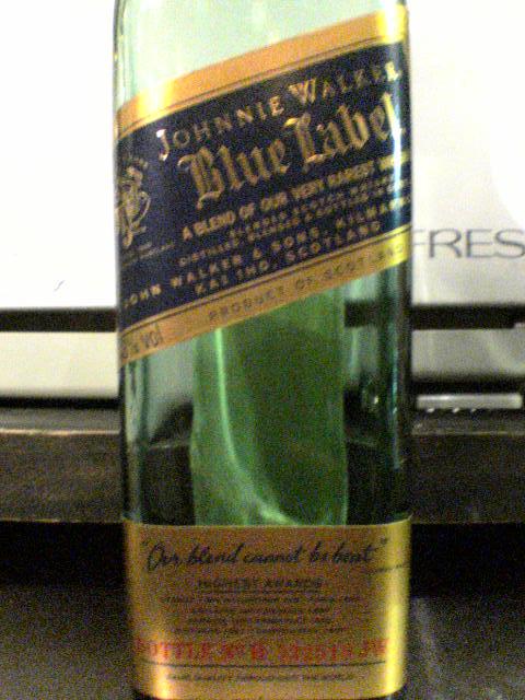今日の一本はジョニウォーカー青ラベル。ジョニといえば黒・赤が一般でその上にグリーン・ゴールドがありますがそのまた上に青があるんです。ゴールドより上が青なんて?味はやっぱり高いだけのことはありますね。映時庵には一つの目標がありそれを達成した記念に空けました。1年間かかりましたけどね(・¥・)