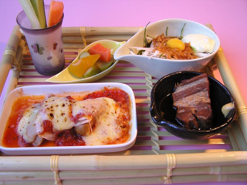 野菜スティック・らふてー・元気盛・ピクルス・そして野菜串またはソーセージのトマトチーズ焼を一つのプレートに盛り合わせました。