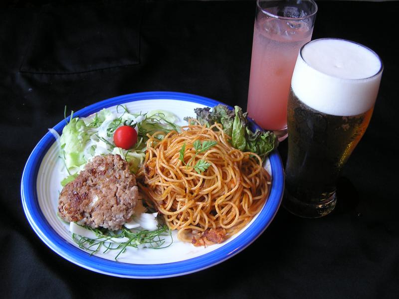 本日のオススメは『ハンバーグ・スパゲティ・サラダ』のセットプレート+ビールorカクテルorソフトドリンクがつく日曜限定プレート=I!