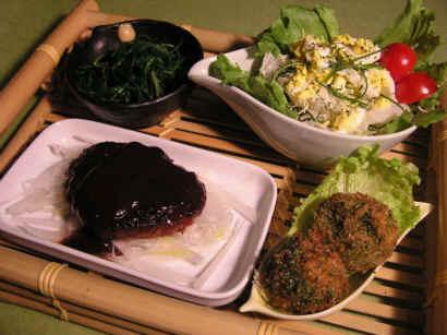 デミグラスハンバーグ・新緑抹茶とショコラのコロッケ・春爛漫ミモザサラダ・おかひじきのおひたしを盛り合わせてプレートにしました!