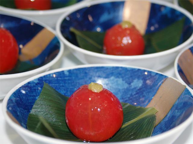 1)ミニトマトの皮を湯むきして、だしで少し煮る。