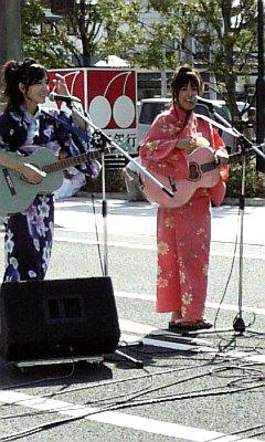 15日にガールズバンドあかなぎが高畠夏祭りに来ました。映画スウィングガールズに出てたピンクの浴衣の人があべなぎささん、青い浴衣の人が岡田茜さんです!今日は高畠で路上ライブをするそうです!