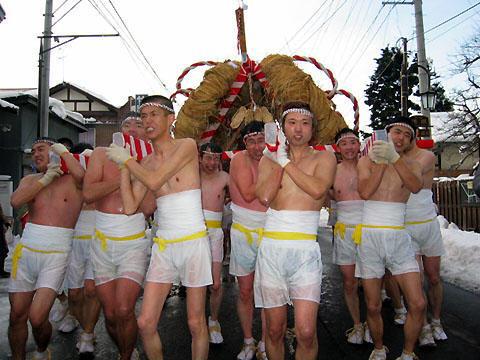 冬の厳しい寒さの中、沿道からの清めの水に肌を赤く染めながら約4Kmの道のりを練歩きます。