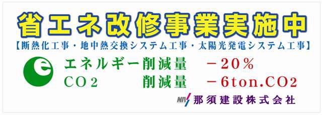 この工事では省エネルギー削減実施目標を対前年度比−20%、Co2削減量を目標−6ton.Co2と設定し、窓サッシの2重化や壁・床・屋根の断熱補強、地中熱利用システム、ソーラーパネルの設置を行います。