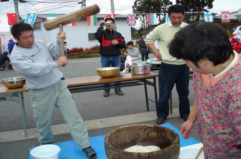 さあもちつきです。じゃがもちにならないようしっかりついてくださいよおー。