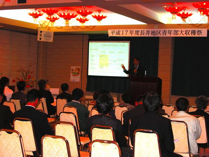 11月12日(土)はぎ苑にて、長井地区青年部の収穫祭が開催されました。また、青果物健康推進委員会事務局長の近藤卓志氏を講師にお招きして『野菜と果物が体にいい本当の理由』と題して講演をしていただきました。講演終了後、青年の主張発表、青年組織支部活動実績発表が行われ、米の食味コンテストの表彰が終わり、懇親会へ移りました。懇親会では農業青年の歌『君と』が代表者により、熱唱されました。