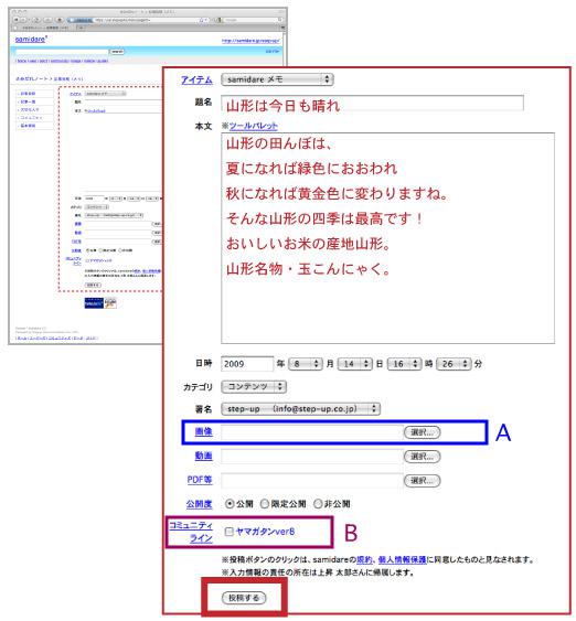 [画像]イメージのようにヤマガタンにチェックを入れていただき「1.」では記事内容に関連するカテゴリを選択してください。「2.」では記事内容に関連するエリアを選択してください。