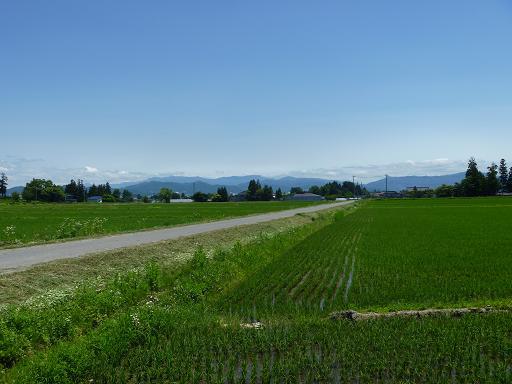 遠くに見える山々と田んぼの緑、空の青さがとても美しいです。