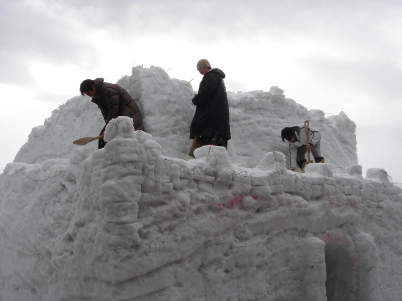 雪をかき集め、山積みにし四角い「豆腐形」に作成して、お城の土台を作る。更に、その土台を何日かねかせ、凍らせなければならない。