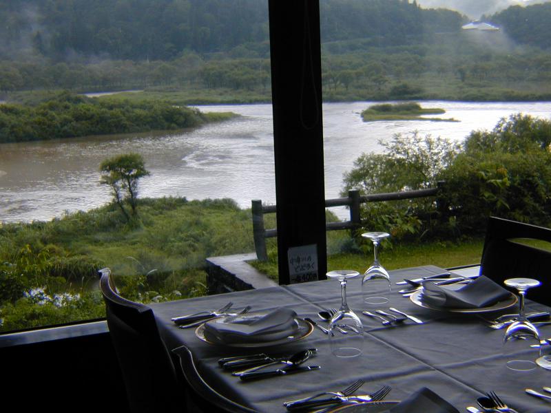 昼ごろから降り出した局地的な雨。レストランに面した白川湖もあっと言う間に増水中。