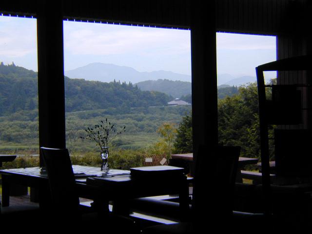 おはようございます。今日はあいにくの曇り空です。霞んではいますが飯豊山がご覧の様に見えてます。フォレストのロビーや各お部屋からは、この様な風景が楽しめます。奥の大日岳には若干残雪がある様です。