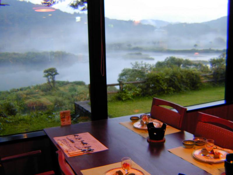 ようやく雨も一時的にやみ、これから夕食です。夕食時間にあわせ窓から見える白川湖もモヤモヤと演出を盛り上げてくれます。