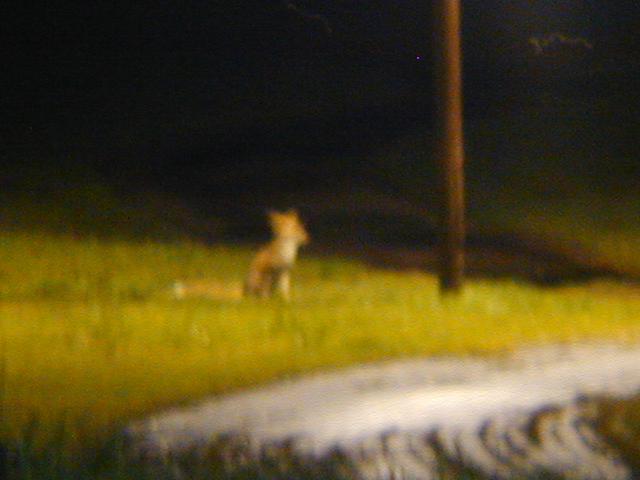 夜のコテージ。外灯を何気に見るとその下にはきつねとあなぐまが仲良くえさを探しに来てました。