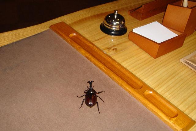 あっ、かぶとむし。しかしここは、「ホテルフォレストいいで」のフロント。こんなところに迷い込むカブトムシの光景も中津川ならでは。