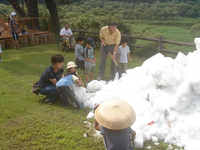 「ホテル フォレストいいで」のテラスに蓄えておいた「雪」の登場。8月14日に行われている「ゆきだるまコンテスト」の光景です。