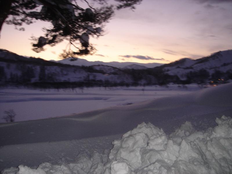「フォレストいいで」のレストランの窓から眺める、「冬の夕暮れ」の景色。