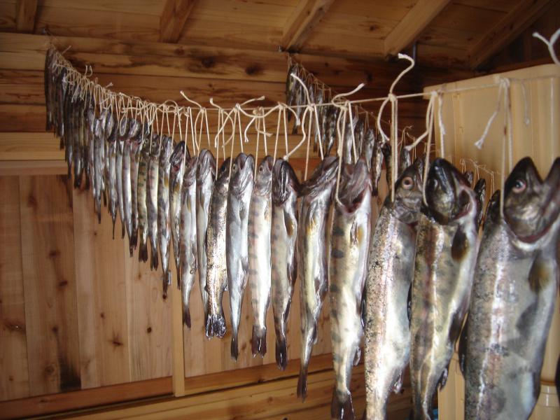 今日は、昨日仕込をした「やまめの寒風干」を1尾づつ吊るした。