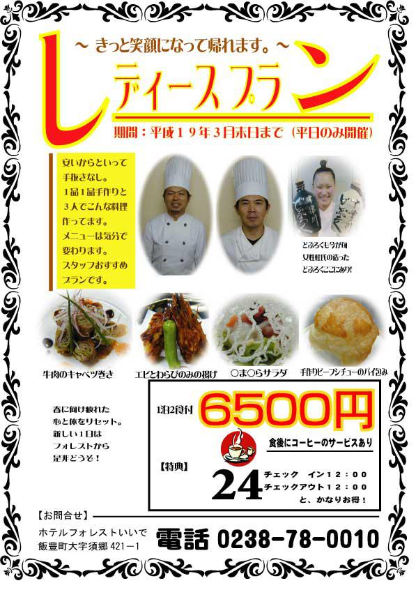 フォレストいいででは3月末までレディースプランを開催中。1泊2食付き6500円。女性の立場に立ってスタッフ一同考えたプランとなっております。お料理は品数は少ないけれど(全部で8品)すべて手間隙かけて「見せる!」事にも力を入れました。チェックインは12:00、チェックアウトは翌12:00のロングステイ。ふだんの疲れを癒して頂ければ、これ幸いと思います。ちょっとしたお友達とのおしゃべりなどにこちらのプランご利用ください。スタッフ一同お待ち致しております。今年は暖冬!アクセス道路も絶好調!