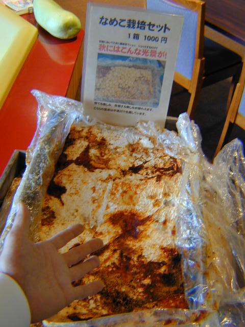 フォレストでは地元のなめこ生産者の方から菌床を頂き、みんなが分かりやすい様”なめこ栽培セット”という名で販売しています。こちらがその栽培セット。37×60センチの箱の中には、木のおがくずになめこの菌が培養されたものがぎっしりと。栽培セットという名の割には管理はいたって簡単。一度包まれたビニール袋をはがして新しい空気を入れ眠っている菌を目覚めさせるだけ。又ビニールをもとに戻しあとは日陰においてそのまま秋まで。地元の方曰く自宅であれば秋にはひしゃまする程(こまった、どうしよう...)収穫できるそうです。