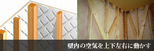 ・断熱材に「ダイヤカット」と呼ばれる通気層の溝を設けて、壁の中の空気をよどむことなく上下左右に動かします。