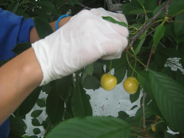 収穫には、ゴム手袋を着けて一粒ずつ大切に行われます。