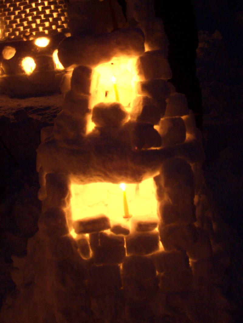 まぁ、それはさておき、そこのご主人の安藤さんの企画で、11年目を迎えるスノーランタンの森作りに行ったのです。ホワイトチョコレートのような香りのするまあるい蜜ロウで蝋燭を作り、お弁当箱で雪レンガを作る。重ねて並べて削って飾って・・・・みんな真剣。不恰好だけど、個性豊かなランタンがずら〜り。点灯式をして火を灯すの。幻想的で何とも言えない優しくて癒される灯火が言いなぁ〜和むよ。あったかいココアを飲みながら、うっとり。幸せ♪
